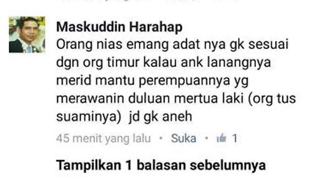 Seorang warga Nias, Sumatera Utara, bernama Dermawati Harefa, belum lama ini melaporkan pemilik akun facebook Maskuddin Harahap ke Polda Metro Jaya. Akun tersebut dilaporkan, karena dianggap mencemarkan nama baik suku Nias melalui media eletronik.