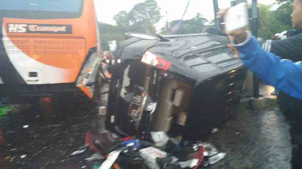 Satu unit bus wisata HS Transport yang tengah melaju dari arah Puncak menuju Jakarta oleng ke jalur ke kanan dan menabrak kendaraan yang ada di depannya.