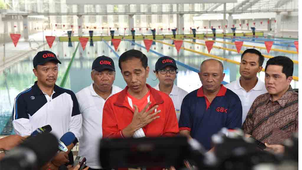 Presiden Jokowi menjawab pertanyaan wartawan usai meresmikan 4 venue yang akan digunakan dalam Asian Games 2018 di kawasan Gelora Bung Karno, Sabtu (2/12). (Foto: Jay)