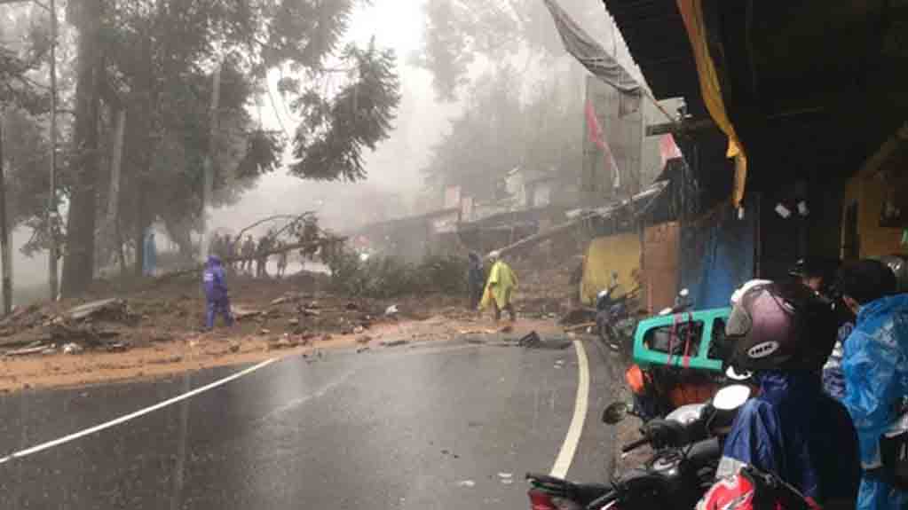 Jalur Jakarta-Puncak terpaksa ditutup sementara karena ruas jalan tertutup pohon dan tiang listrik yang rubuh. Gundukan tanah juga terlihat di sana-sini.