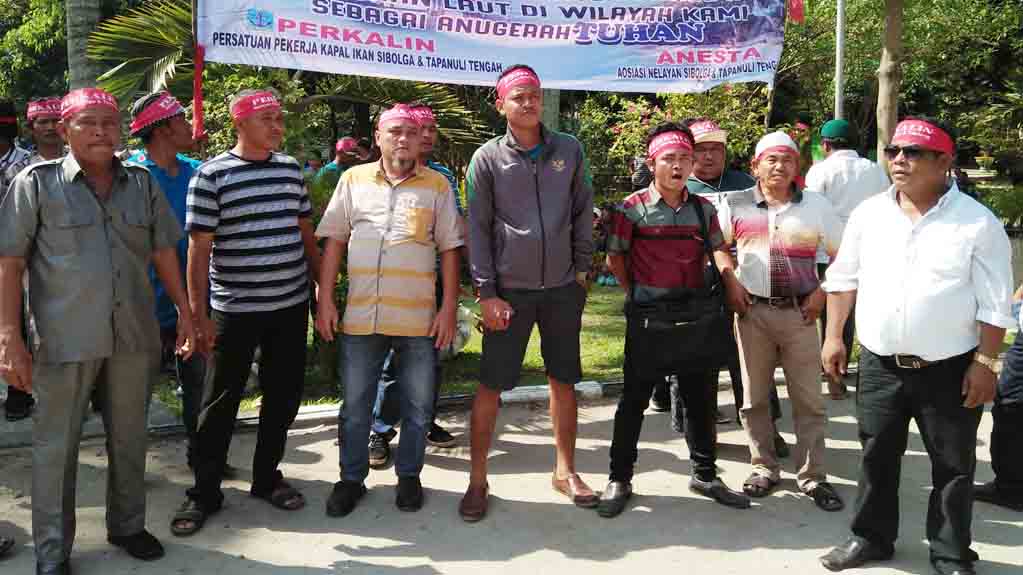 Para nelayan Sibolga yang berunjuk rasa tergabung dalam wadah Persatuan Pekerja Kapal IkanSibolga & Tapanuli Tengah (Perkalin) dan Asosiasi Nelayan Sibolga dan Tapanuli Tengah (Anesta).