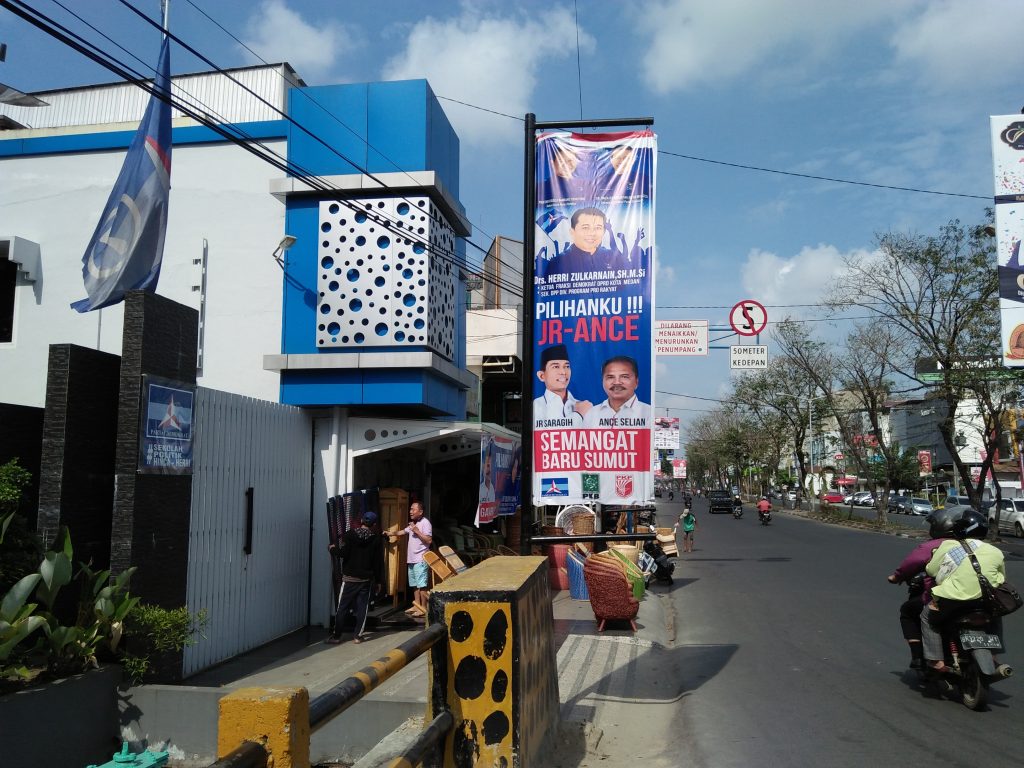 Di spanduk yang memanjang ke bawah itu, ada foto JR Saragih – Ance Selian, foto Herry Zulkarnaen Hutajulu (Ketua Fraksi Partai Demokrat DPRD Medan) dan foto Hinca Panjaitan (Sekjen DPP Partai Demokrat).