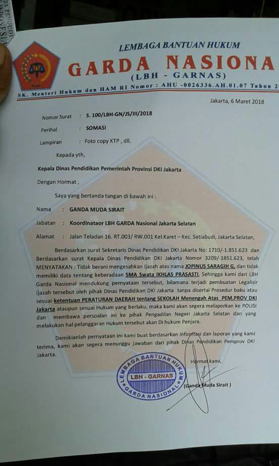Koordinator LBH Garda Nasional (Garnas), Ganda Muda Sirait, melayangkan surat somasi yang ditujukan kepada Kepala Dinas Pendidikan Provinsi DKI Jakarta, dengan nomor: S.100/LBH-GN/JS/III/2018, tertanggal 6 Maret 2018.