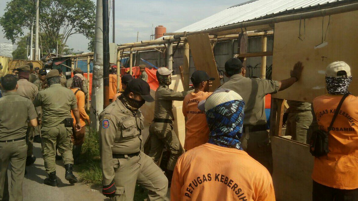 Kabupaten Tangerang – Satuan Polisi Pamong Praja (Satpol PP) Kecamatan Kosambi membongkar puluhan bangunan liar tanpa izin di Jalan Raya Salembaran Kecamatan Kosambi, Kabupaten Tangerang, Kamis (12/04/2018)