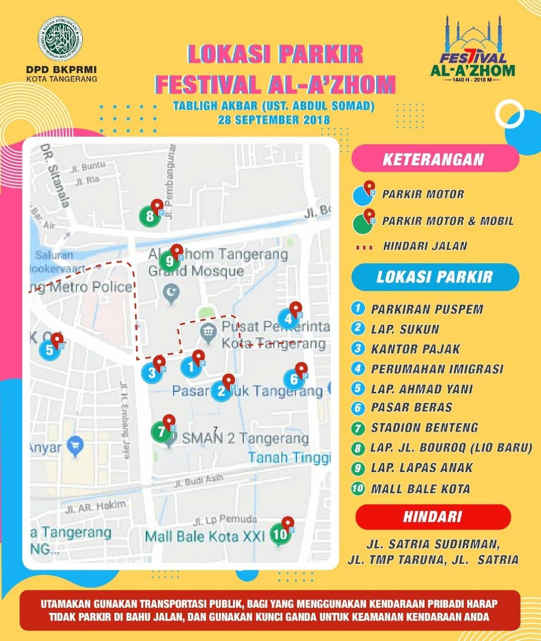 Kota Tangerang – Dinas Perhubungan Kota Tangerang menyiapkan 10 kantong parkir untuk menampung kendaraan masyarakat yang ingin menghadiri Tabligh Akbar Festival Al-Azhom yang akan dihadiri Ustadz Abdul Somad, Jum’at (28/9/2018) besok.