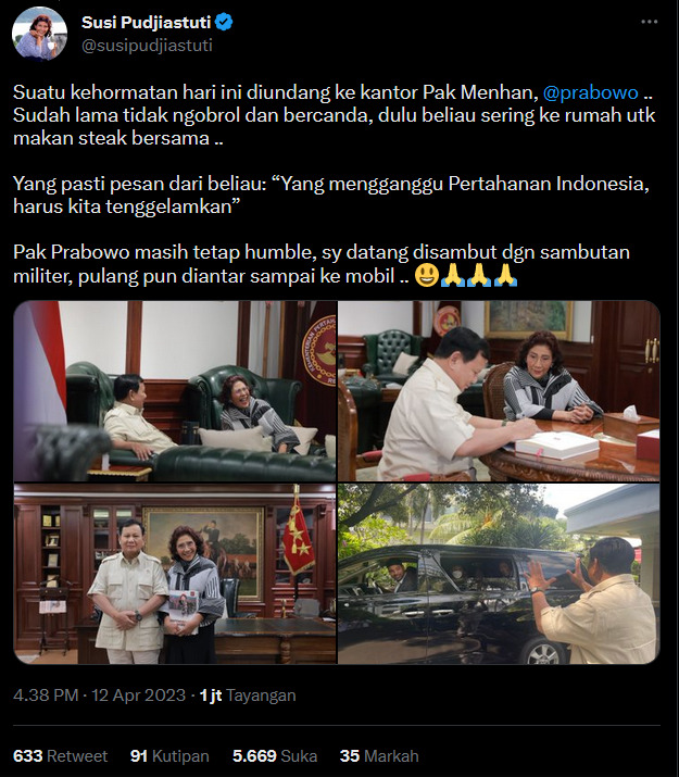 “Suatu kehormatan hari ini diundang ke kantor Pak Menhan, @prabowo. Sudah lama tidak ngobrol dan bercanda, dulu beliau sering ke rumah untuk makan steak bersama. Pak Prabowo masih tetap humble, sy datang disambut dgn sambutan militer, pulang pun diantar sampai ke mobil,” tulis bu Susi.